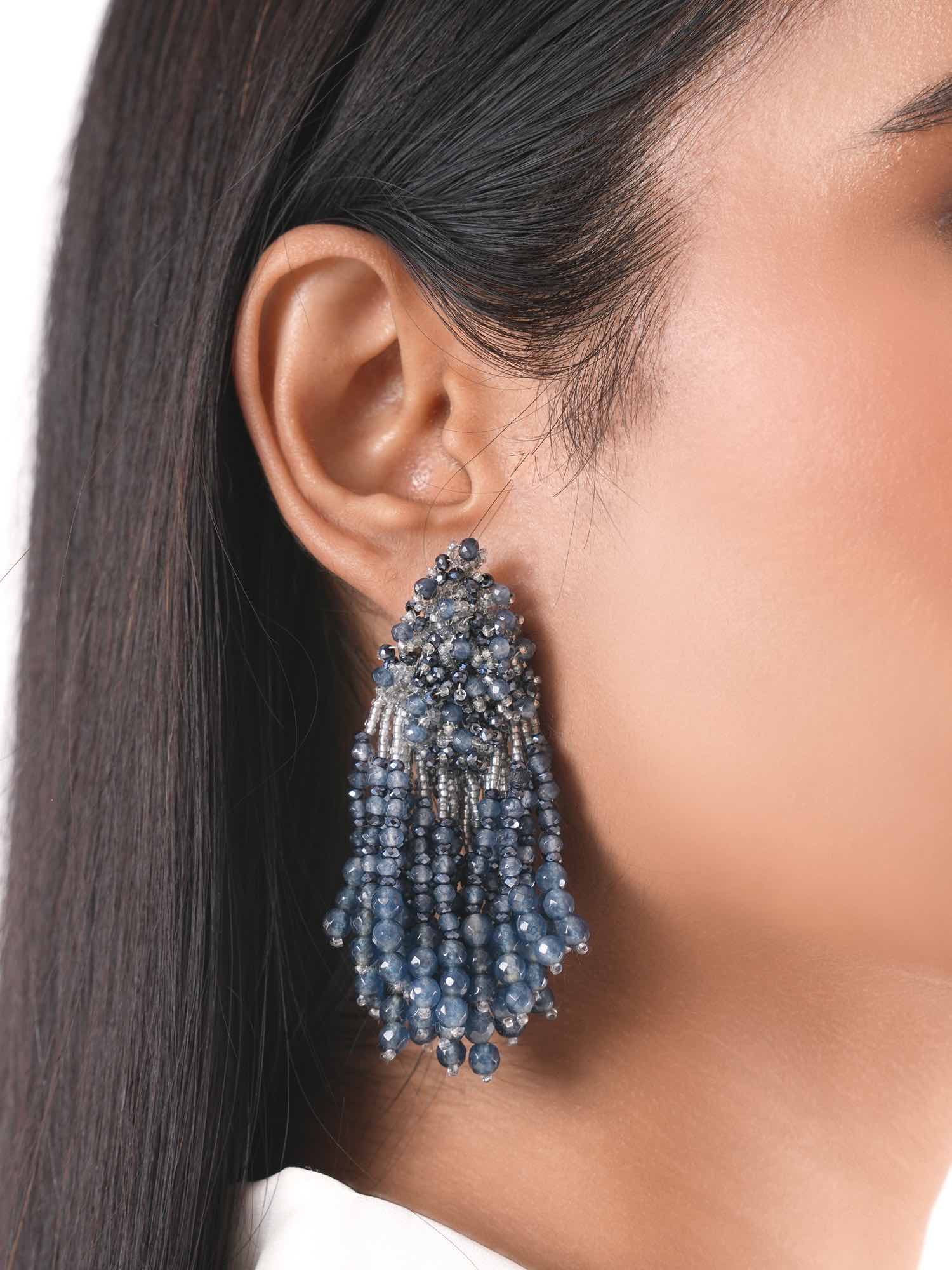 Elevate your look with our Aqua Drape Earrings. Featuring a harmonious blend of shimmering blue and silver beads, these earrings offer a sophisticated touch of elegance and sparkle. Perfect for adding a chic, contemporary flair to any outfit.