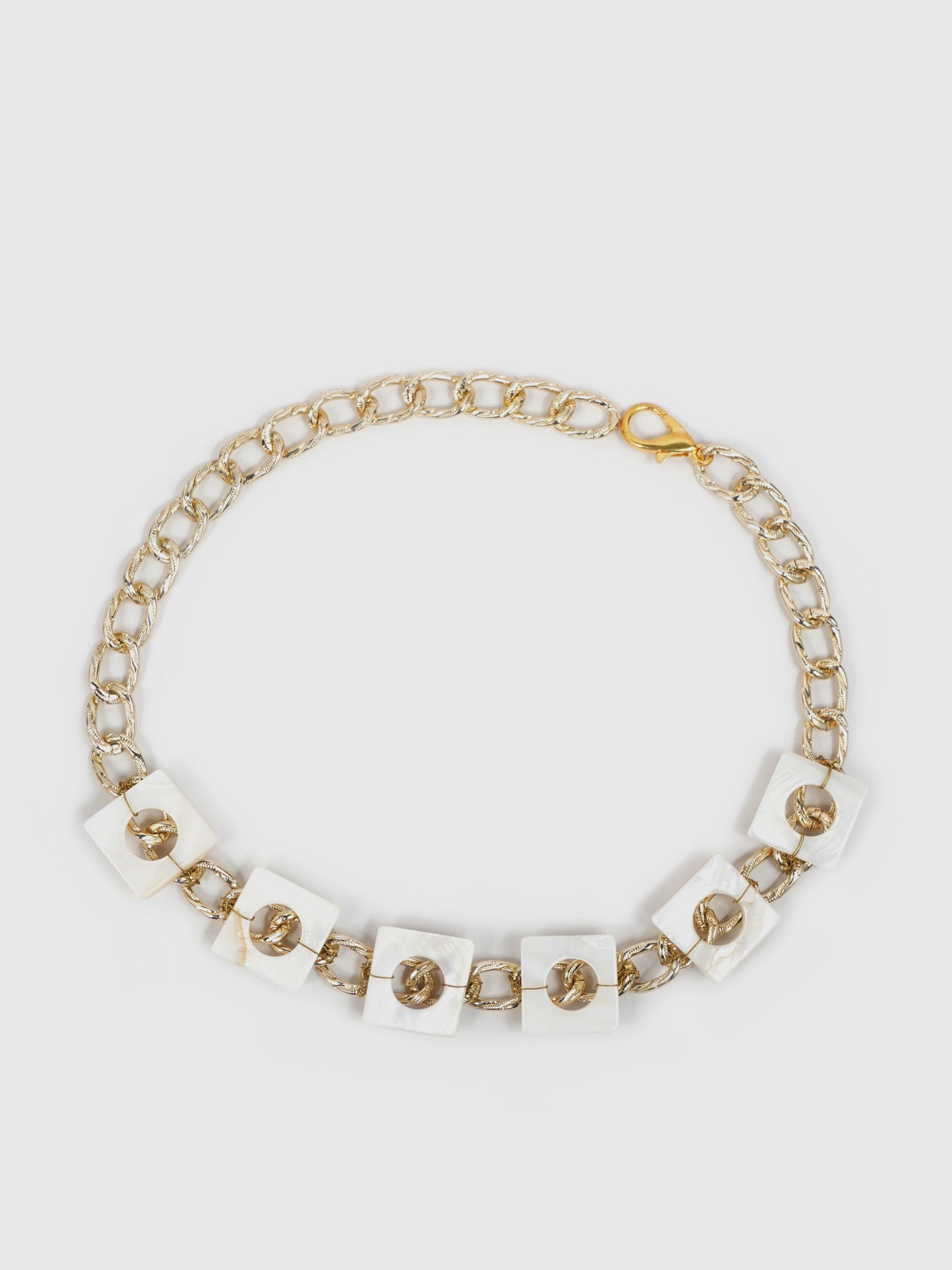 Aureate Nexus is a mesmerizing necklace that radiates elegance and sophistication. Crafted from a brilliant golden chain, it features a series of flat, hollow square white stones elegantly positioned atop the chain. These stones, with their pristine white color, create a striking contrast against the radiant gold backdrop. The design exudes a sense of modernity and luxury, with the geometric arrangement of the stones adding a touch of contemporary flair. Aureate Nexus is a statement piece that effortlessly combines classic and contemporary elements, making it a timeless addition to any jewelry collection.
