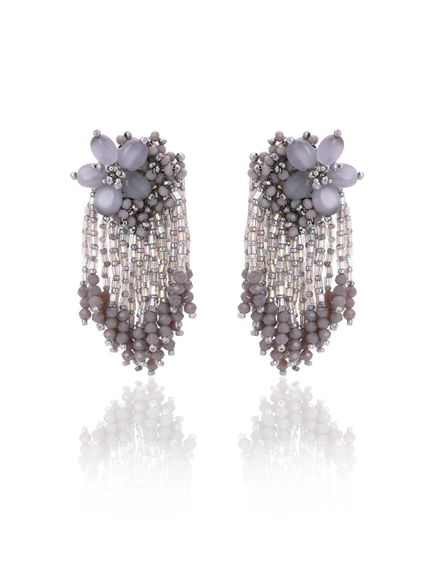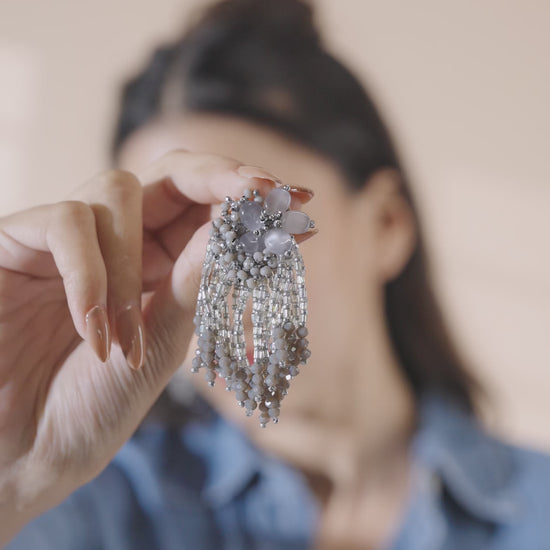 Elevate your style with our Coral Cascade Earrings, showcasing a graceful floral pattern adorned with elegant grey beads and stones. These earrings offer a sophisticated touch to any outfit, blending timeless beauty with modern charm. Perfect for any occasion, the Coral Cascade Earrings will add a refined sparkle to your look.