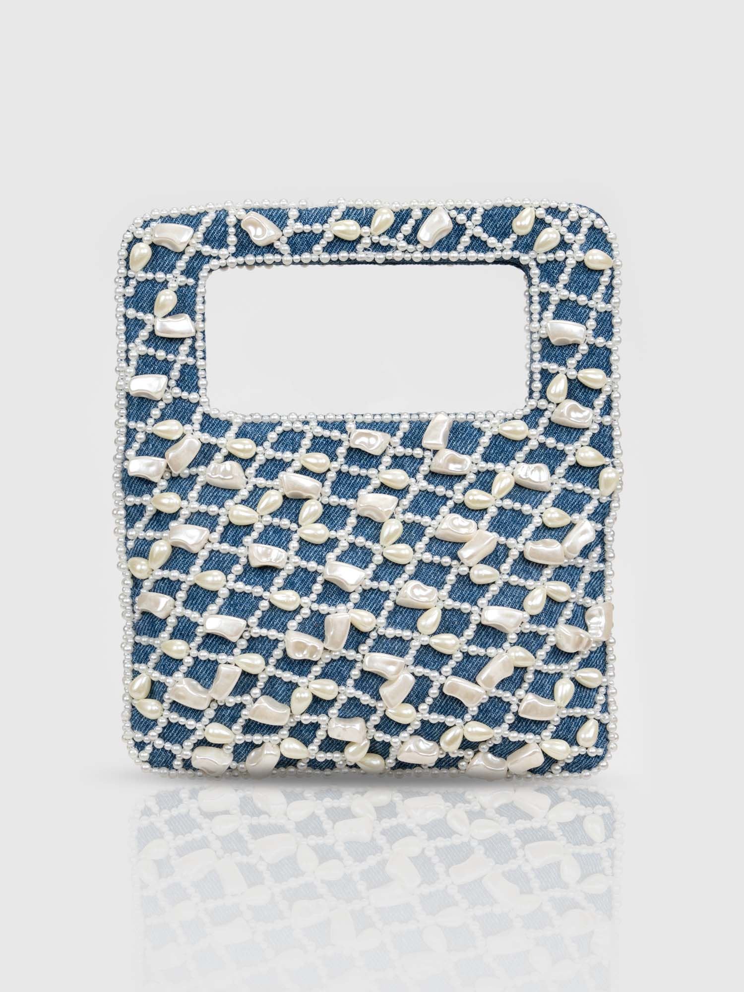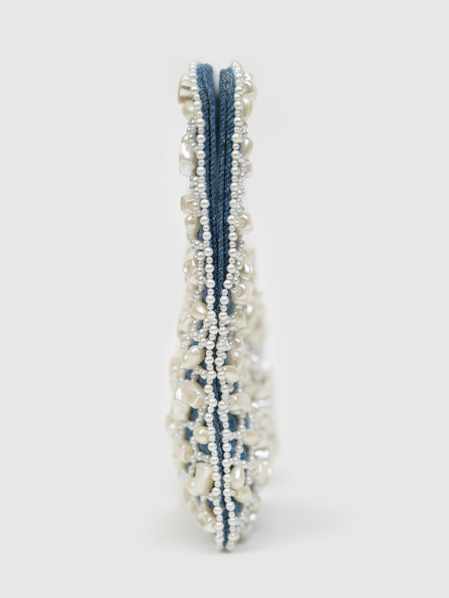 The Nouveau Denim Bougette Bag in Blue is a designer occasion bag that exudes elegance and sophistication. Crafted from premium denim material, this bag features exquisite detailing of Bougette Pearls , making it a stylish accessory for any special event. It also ensures that you can carry your essentials in utmost luxury. Elevate your ensemble with the Nouveau Denim Bougette Bag, the perfect statement piece for any occasion.