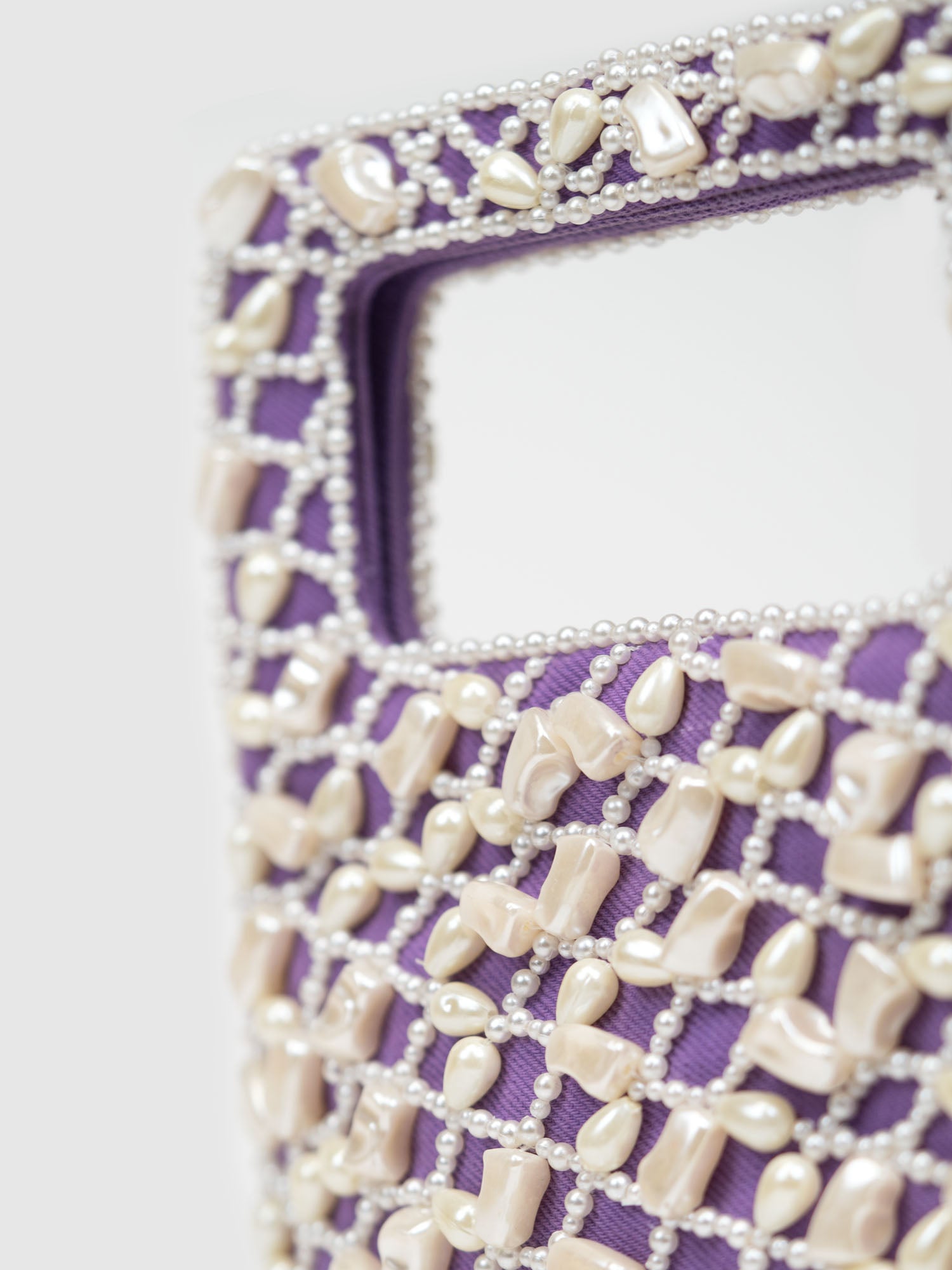 The Nouveau Denim Bougette Bag in Purple is a designer occasion bag that exudes elegance and sophistication. Crafted from premium denim material, this bag features exquisite detailing of Bougette Pearls , making it a stylish accessory for any special event. It also ensures that you can carry your essentials in utmost luxury. Elevate your ensemble with the Nouveau Denim Bougette Bag, the perfect statement piece for any occasion.
