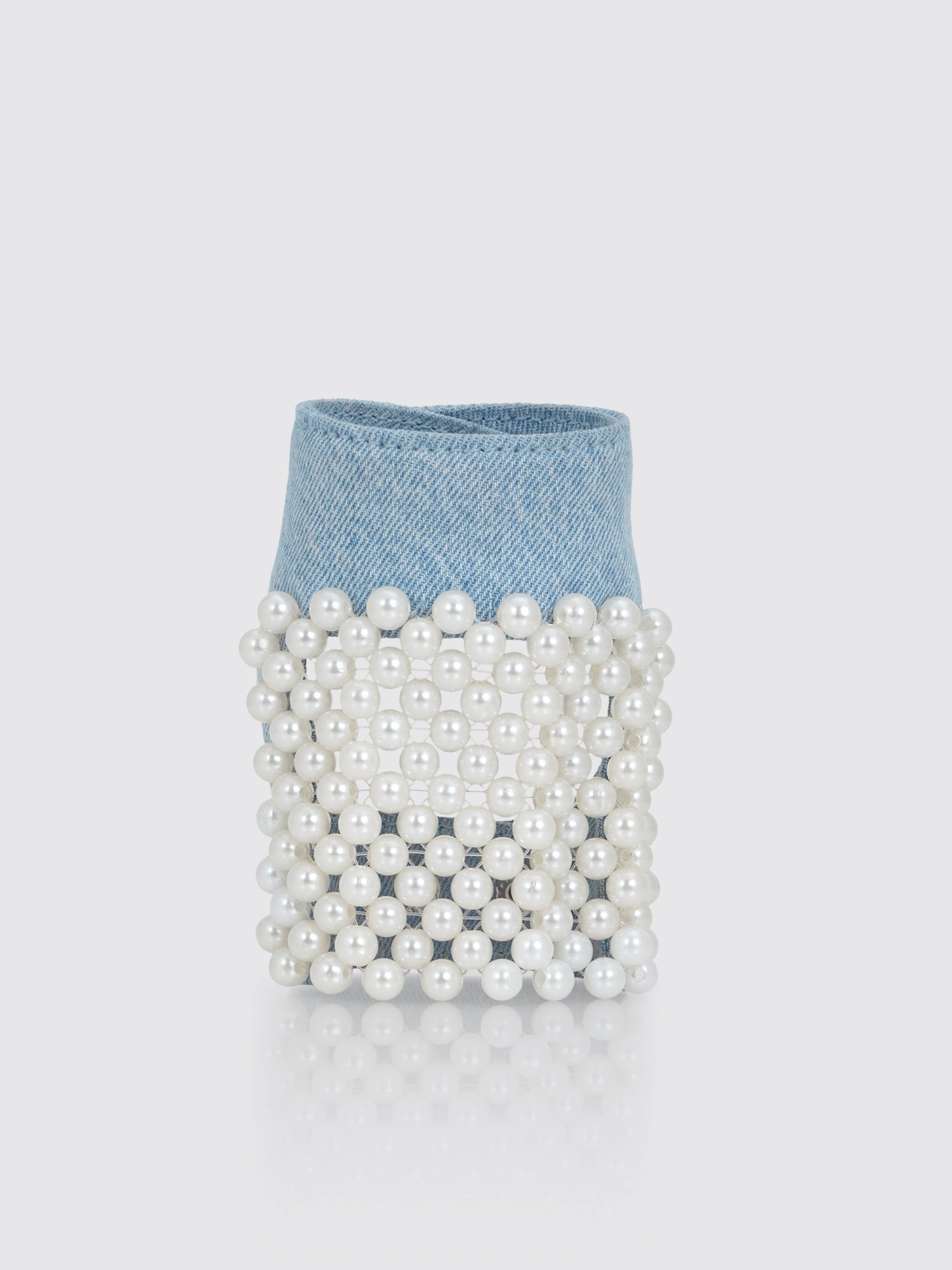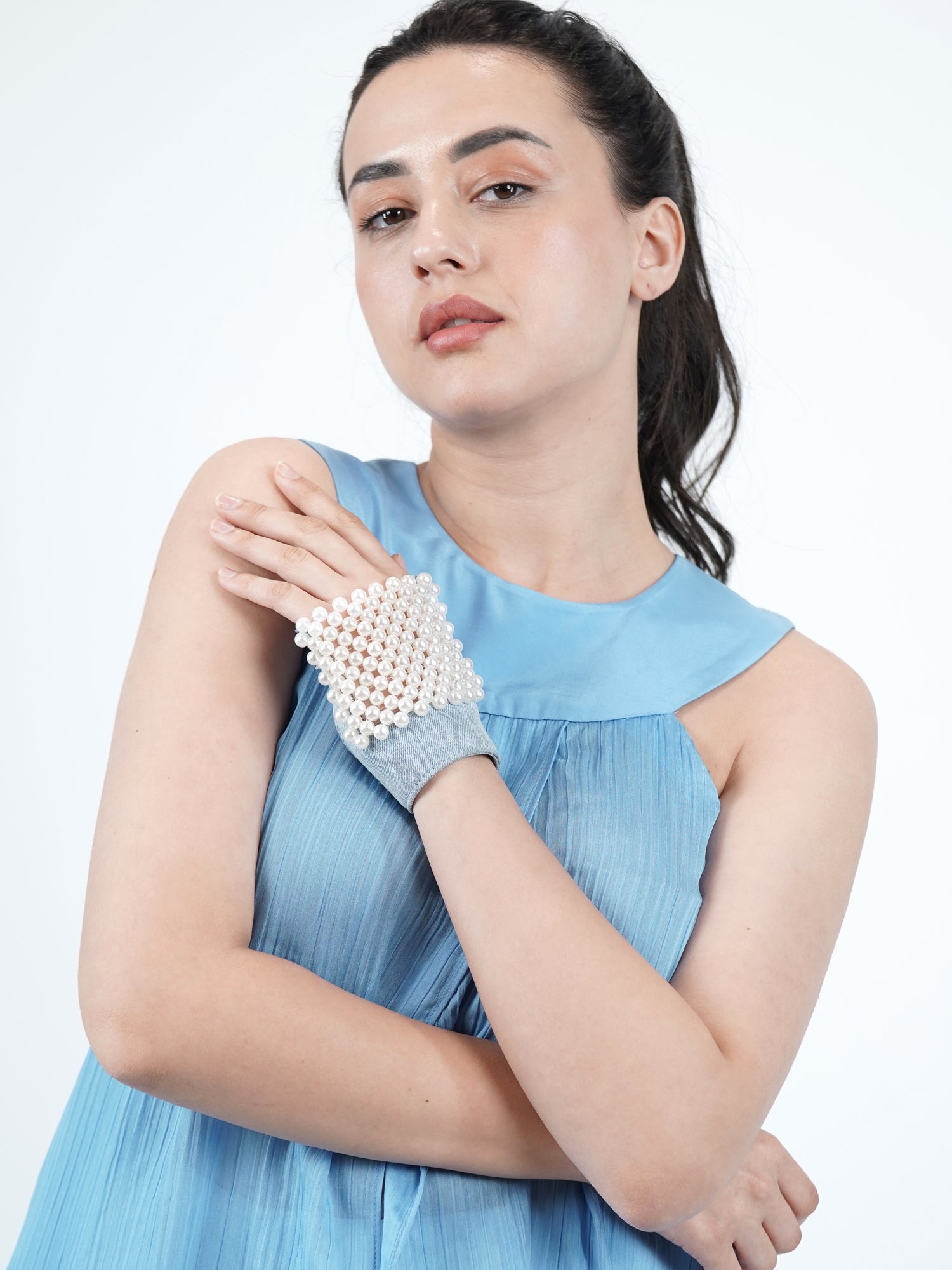 Denim Drapery Pearl Embellisshed Gloves