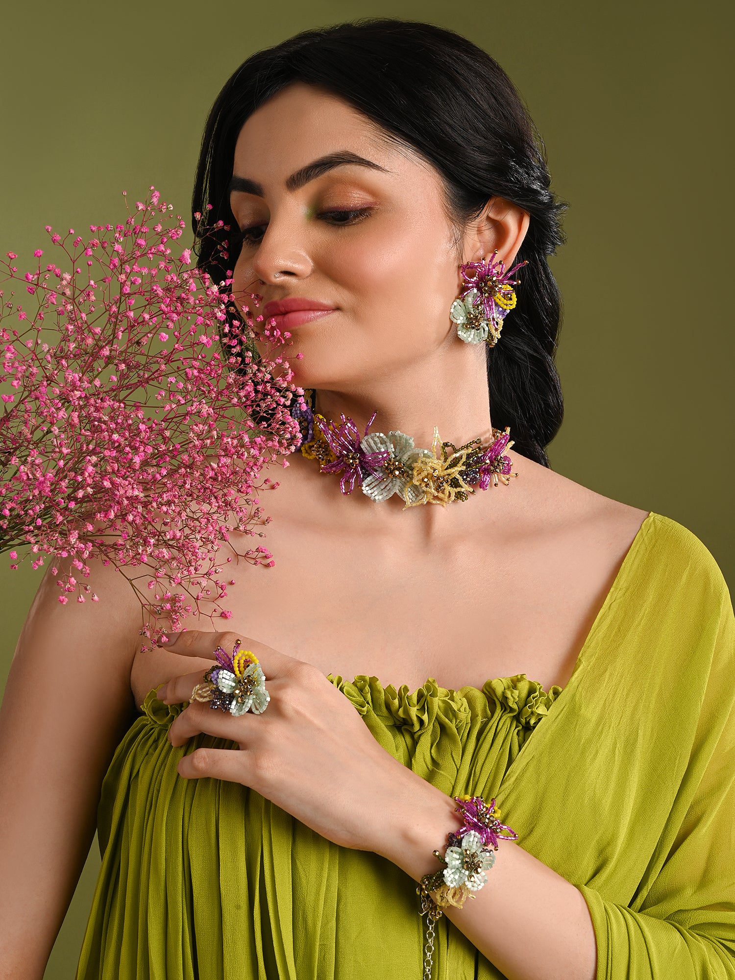 the Florabell Choker Set is inspired by bell-shaped blossoms swaying in a spring breeze. With soft curves, intricate detailing, and matching earrings, this set brings a gentle floral charm to your neckline — perfect for festive wear or soft statement styling.