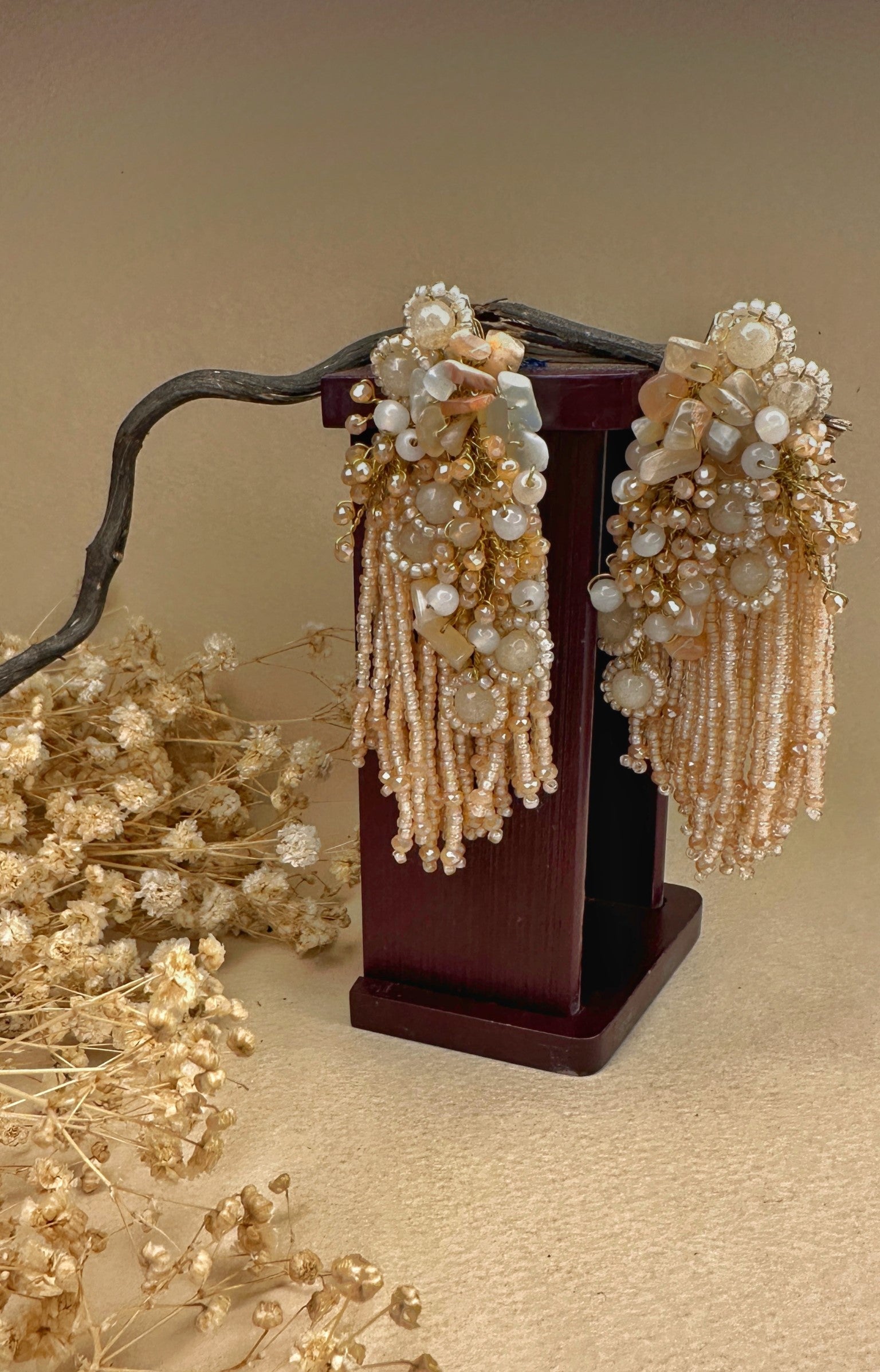 A statement pair of handcrafted earrings featuring cascading beads, pearls, and delicate stones. Designed with layers of ivory and champagne-toned embellishments, these earrings bring an elegant blend of texture and movement—perfect for weddings, festive occasions, or evening glamour.
