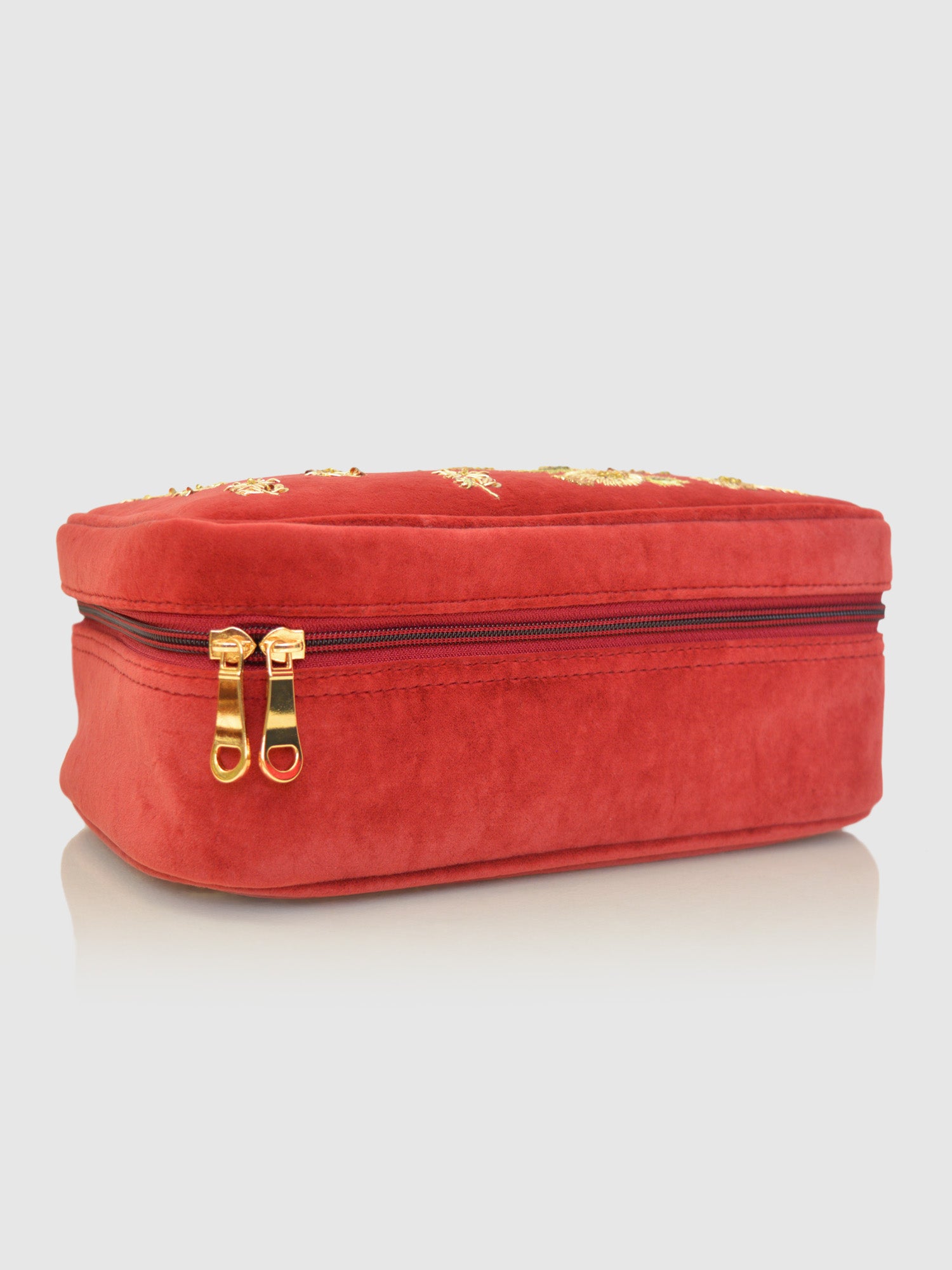 The JewelNest Organizer Bag handworked with premium Zardosi and sequence work on high quality velvet is the ultimate storage solution for your precious accessories. Featuring over five dedicated pouches, including two spacious compartments for larger items, and three flat pouches for optimal organization, this bag ensures your bangles, earrings, and rings are perfectly segregated and easy to access. Its sleek design and thoughtful layout make it an essential for travel and everyday use, keeping your jewelry safe, organized, and tangle-free.
