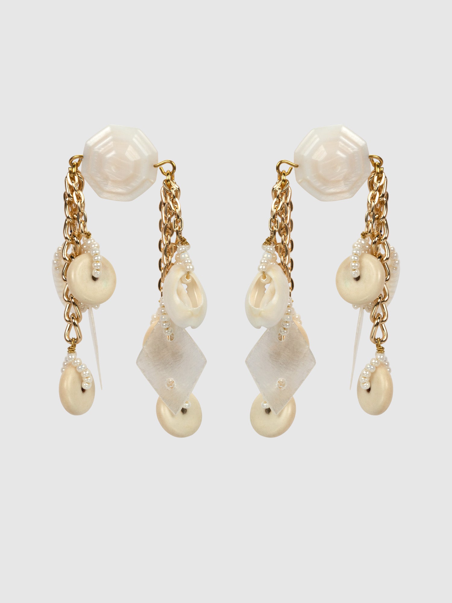 Ivory Gleam is an enchanting asymmetrical earring adorned with a pristine white top, radiating timeless elegance. Extending from the central piece are delicate golden chains on both sides, each showcasing a collection of white flat stones with varying opacities at the bottom. This design combines sophistication with natural allure, creating a distinctive and captivating accessory that captures the essence of ivory's gentle gleam.