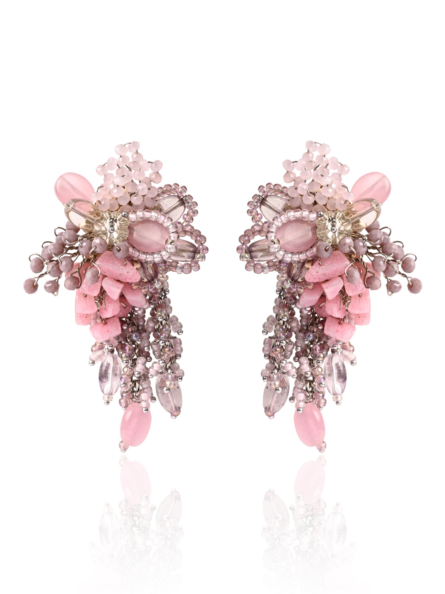 Pink And Lilac Stone Medium Size Chain Tassel Earrings