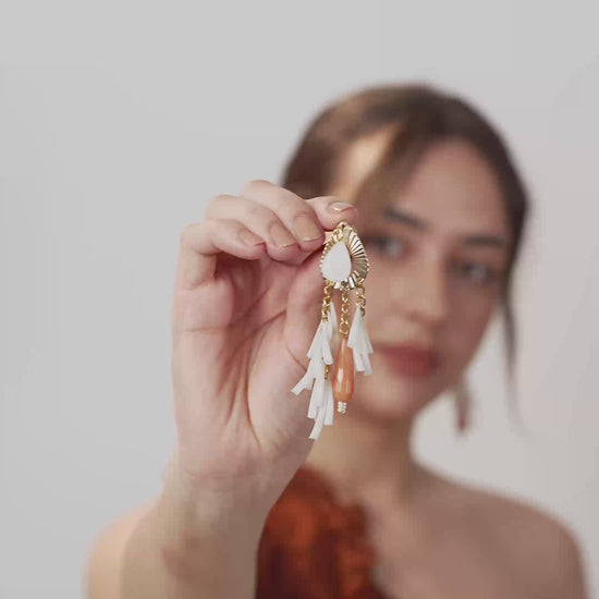 Lustrous Whisper is an opulent earring designed with a golden base that gleams with sophistication. Adorned with a profusion of lustrous white and long shells, it creates a captivating cascade. At its heart, a delicate peach stone takes center stage, adding a touch of warmth and allure. This earring embodies timeless elegance and luxury, making it a striking choice for special occasions and glamorous events.