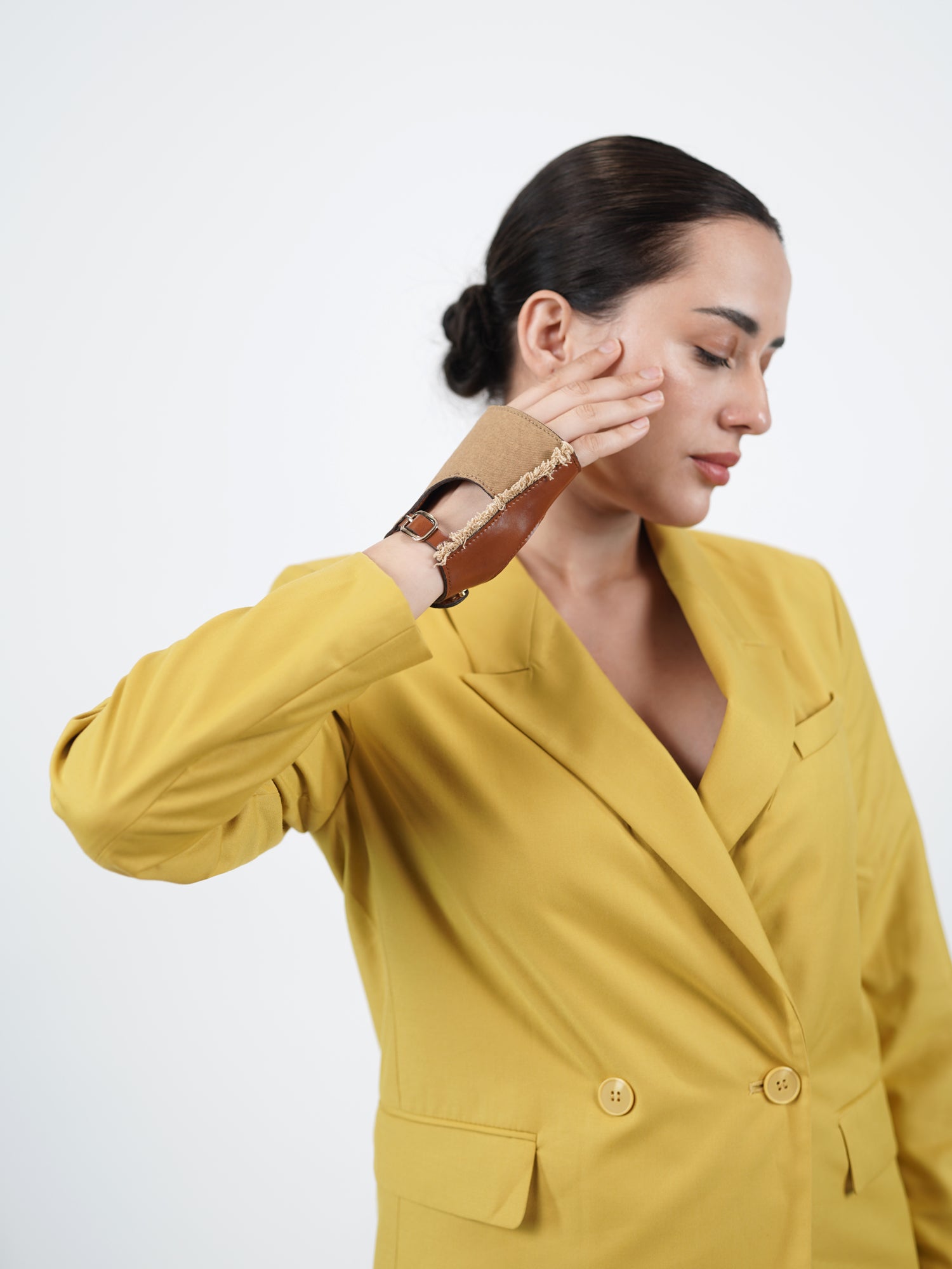 All materials are sourced for their unique qualities and carefully crafted. Any incidental marks, tonal changes, and/or textural variances are part of the material’s natural characteristics and should not be considered imperfections. Avoid direct contact with rain, heat, oil, grease (make-up), alcohol (perfume, solvents), and other abrasive products. To clean each piece of accessory, wipe with a soft cloth. To preserve the original quality of the accessory, store your accessory in brand-provided packaging when not in use.