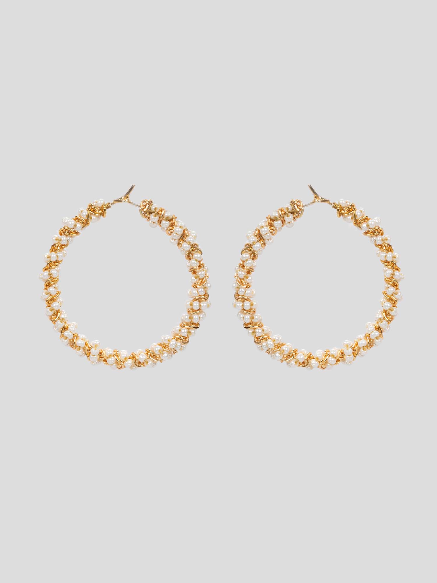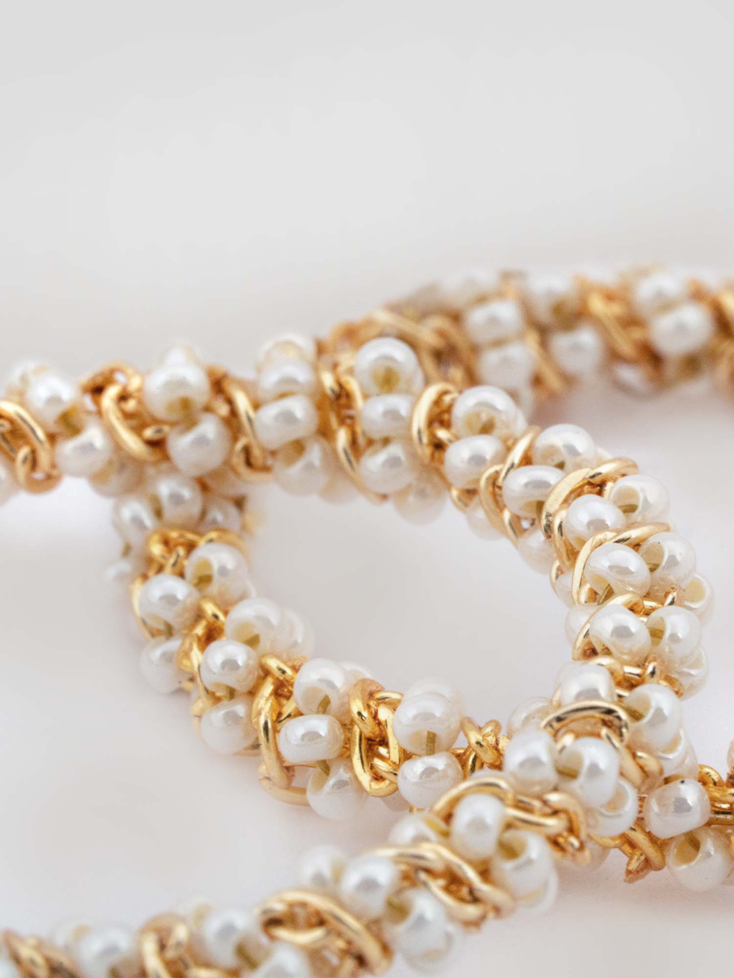 The Orbit Charm hoop earring features a radiant golden base elegantly adorned with a spiral of pristine white beads, creating a celestial and timeless design. The interplay of gold and white evokes a sense of sophistication and charm, making it a versatile accessory suitable for both casual and formal occasions. These hoops exude an understated elegance, adding a touch of celestial allure to any ensemble.