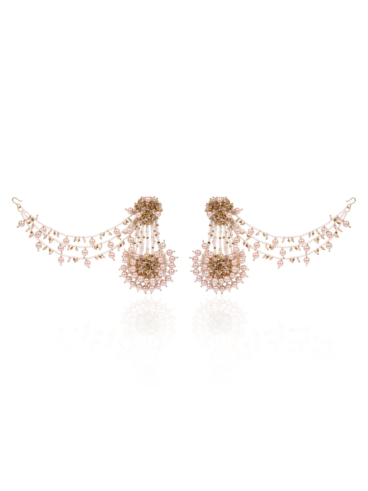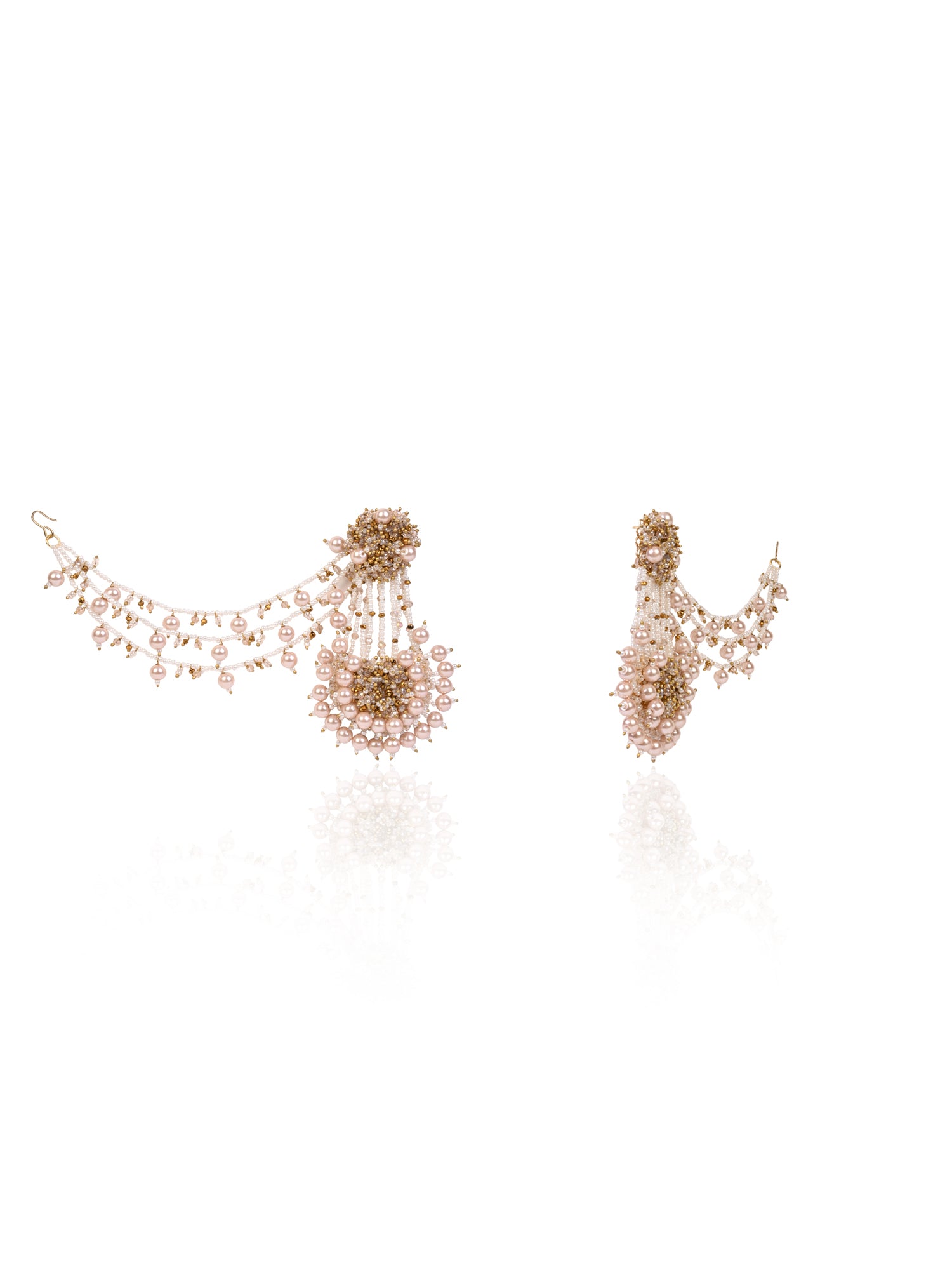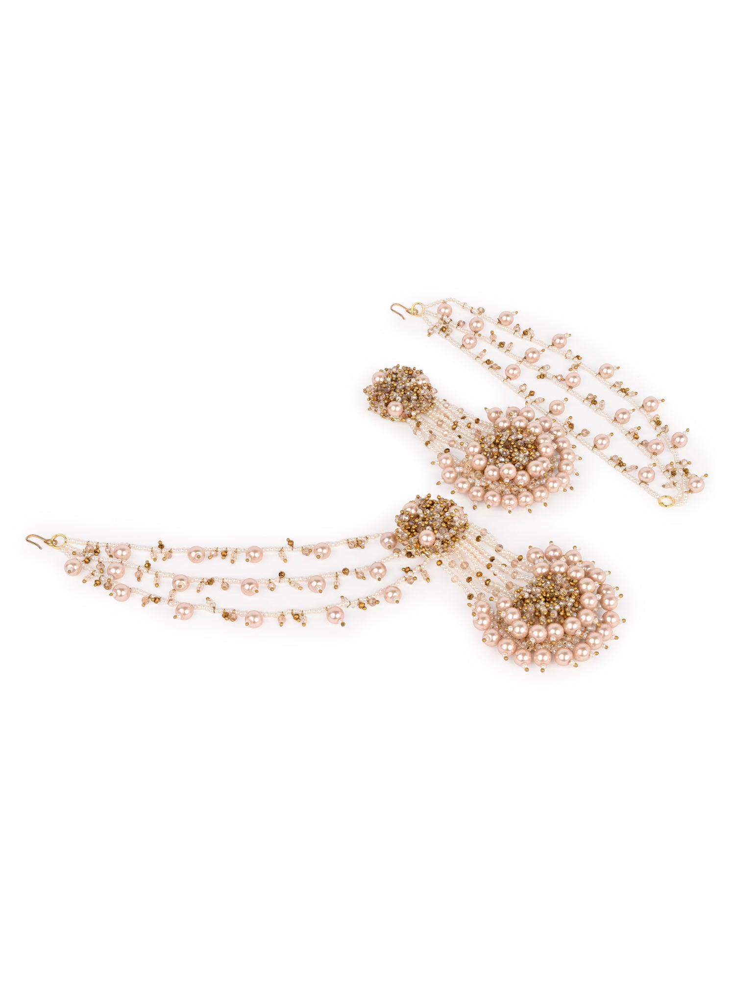 Peach pearl chandbali earrings adorned with gold stones and graceful side extensions for hair locks, crafted on a gold-plated base metal. Elegant and festive, they add traditional charm and refined beauty to bridal and occasion wear.