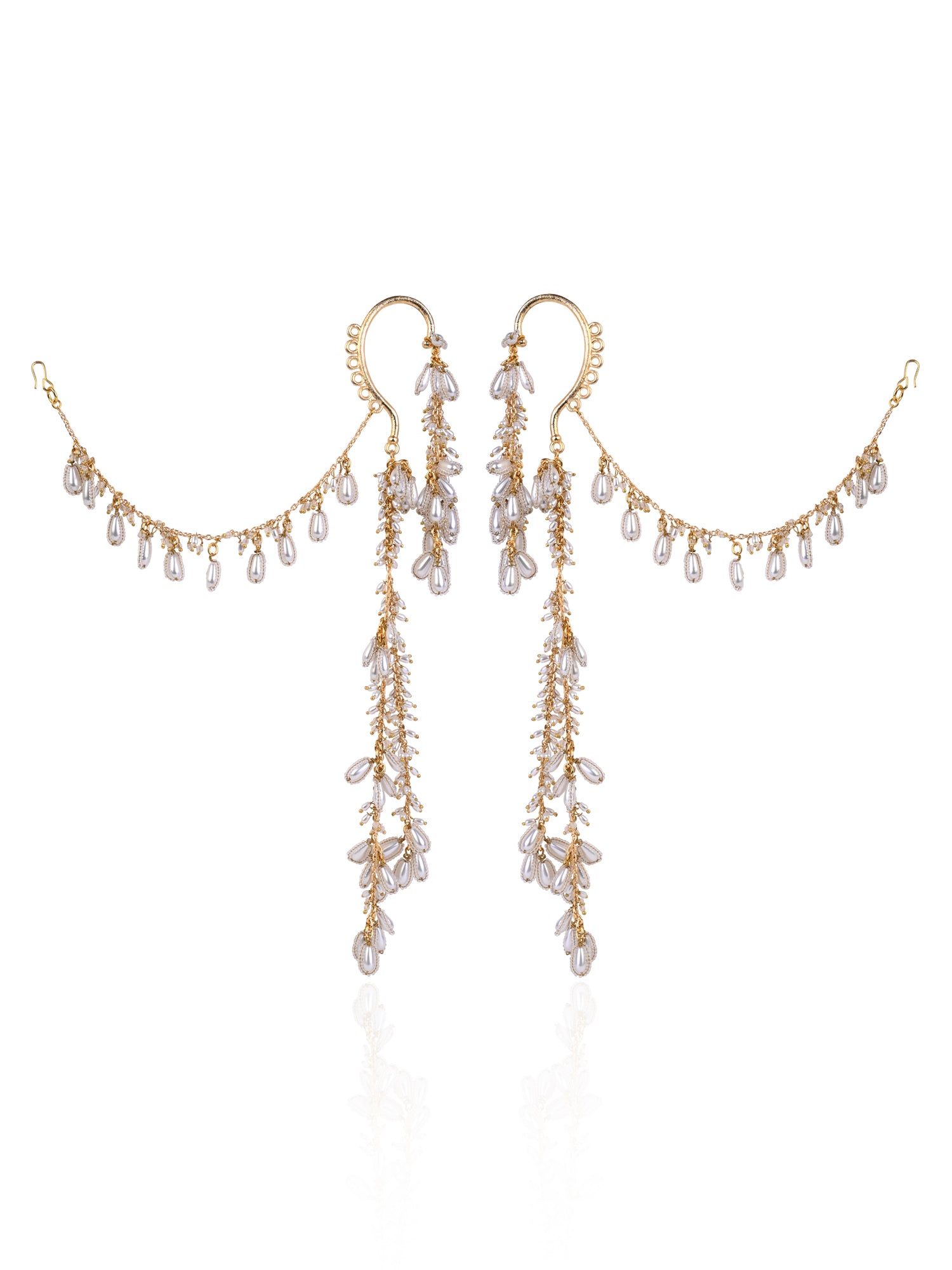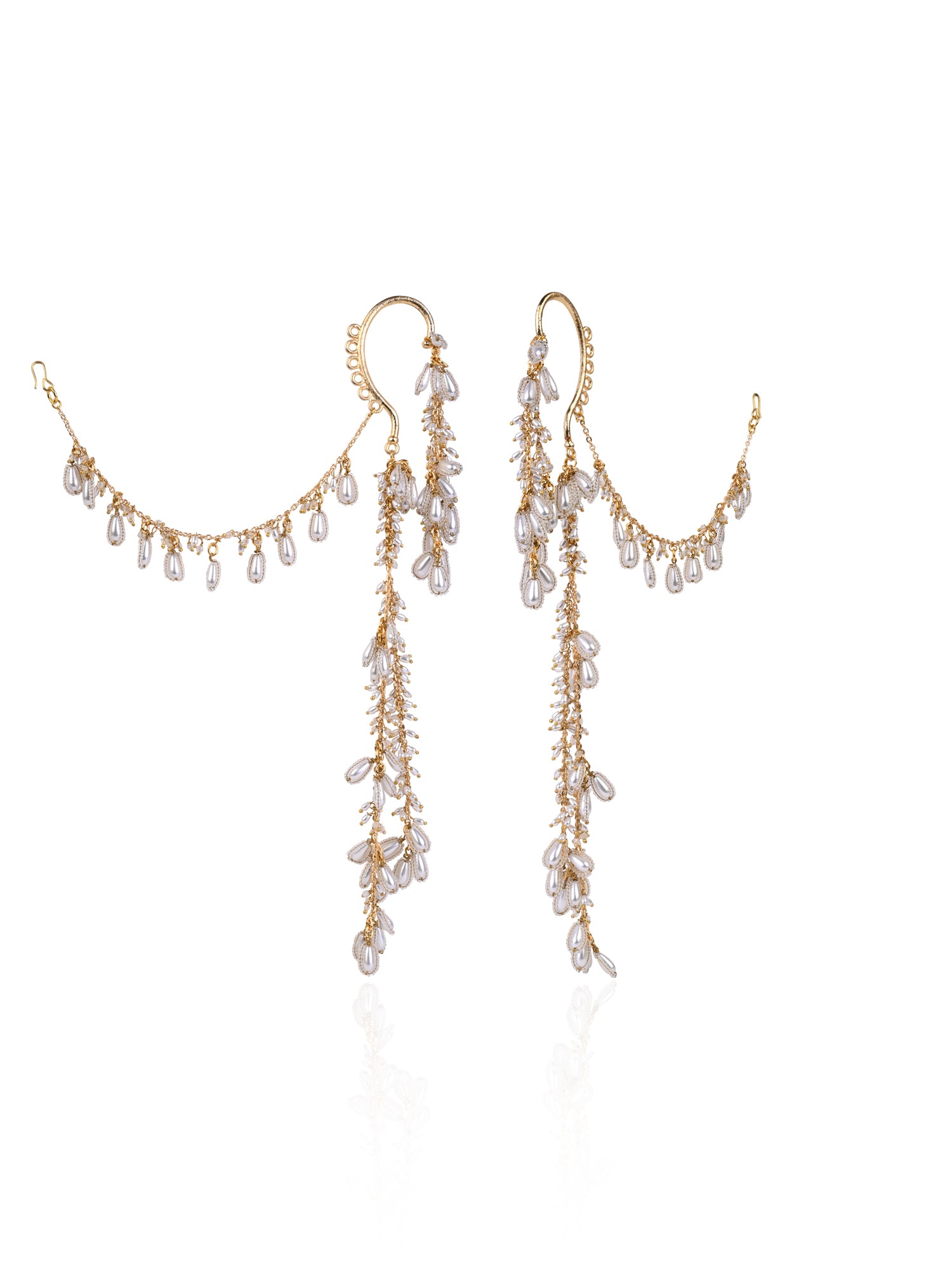 "Add a touch of royal elegance with these gold-plated pearl drop earcuffs, featuring delicate bunches and a side kaan chain that beautifully adorns your hairstyle. Perfect for weddings, festive occasions, or glamorous parties, these intricately bejeweled earrings effortlessly elevate any outfit with their timeless charm and graceful sparkle."