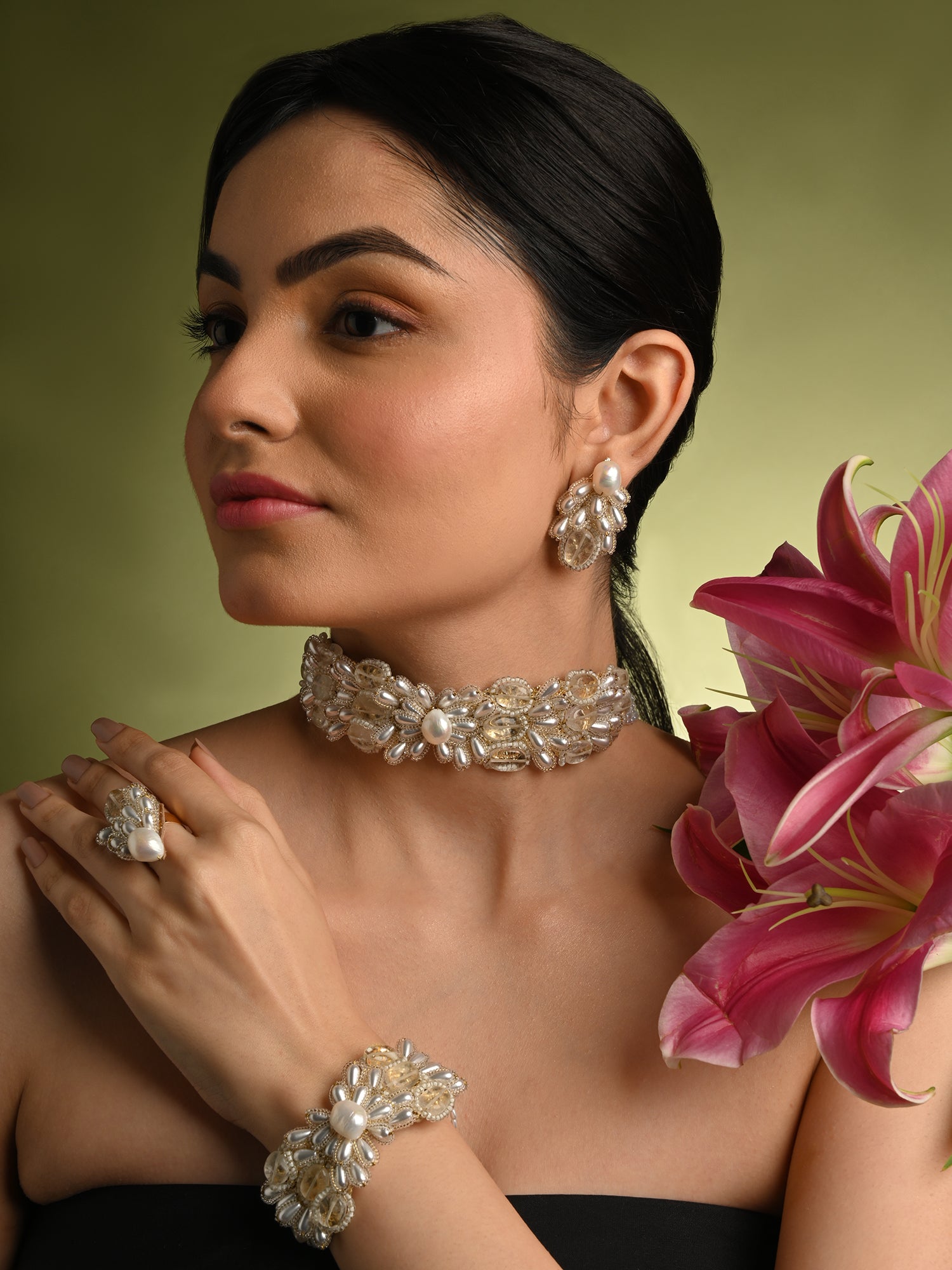 the Serenebloom Choker Set captures the elegance of a garden in stillness. With soft floral detailing and a serene silhouette, this set (choker + earrings) adds quiet charm and timeless grace to any look.