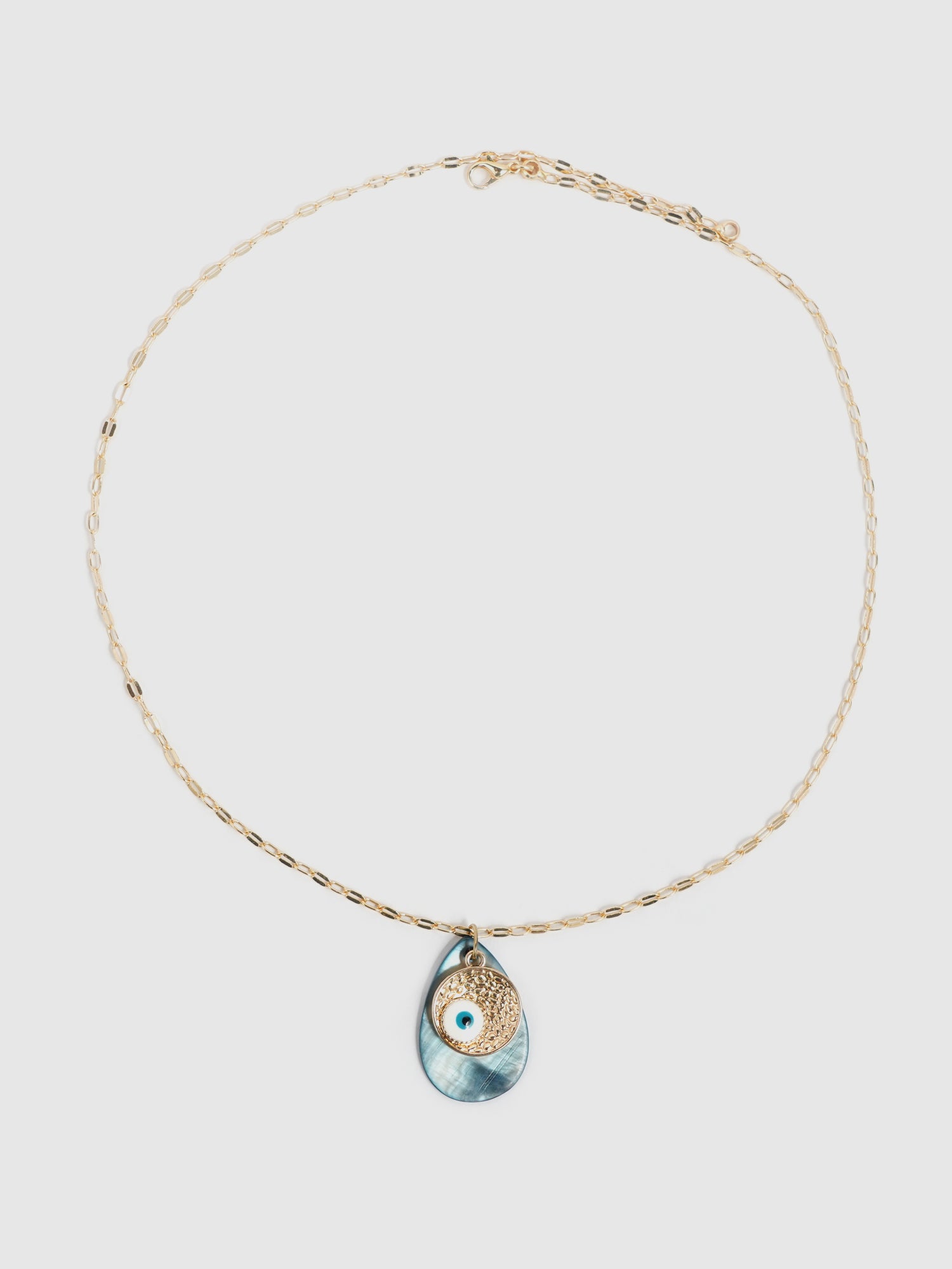 Serene Sentinel is a beautifully balanced necklace that exudes an air of calm and protection. It features a simple, delicate chain adorned with three distinct pendants that gracefully overlap. The first pendant is a serene blue stone, evoking a sense of tranquility and inner peace. Next, a golden coin pendant adds a touch of timeless elegance and prosperity. Lastly, the protective evil eye pendant watches over, warding off negativity and providing a sense of security. This combination creates a harmonious and meaningful piece, representing serenity, prosperity, and safeguarding energies.