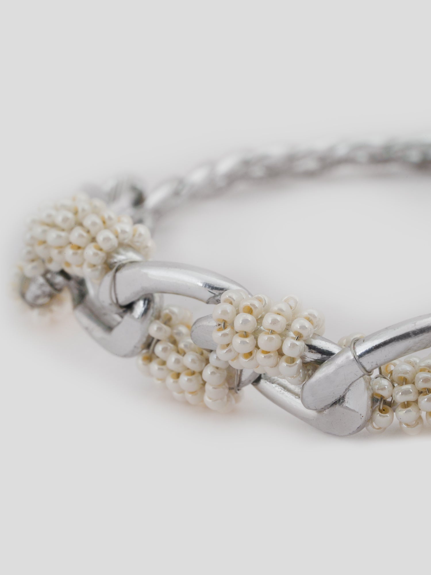 Snowflake Link is an enchanting bracelet crafted from a substantial silver chain with a distinctive design. Its alternating sides are adorned with lustrous white beads, reminiscent of delicate snowflakes. This design artfully blends the durability of silver with the purity of white, creating a unique and captivating accessory that evokes the charm and elegance of a winter wonderland.