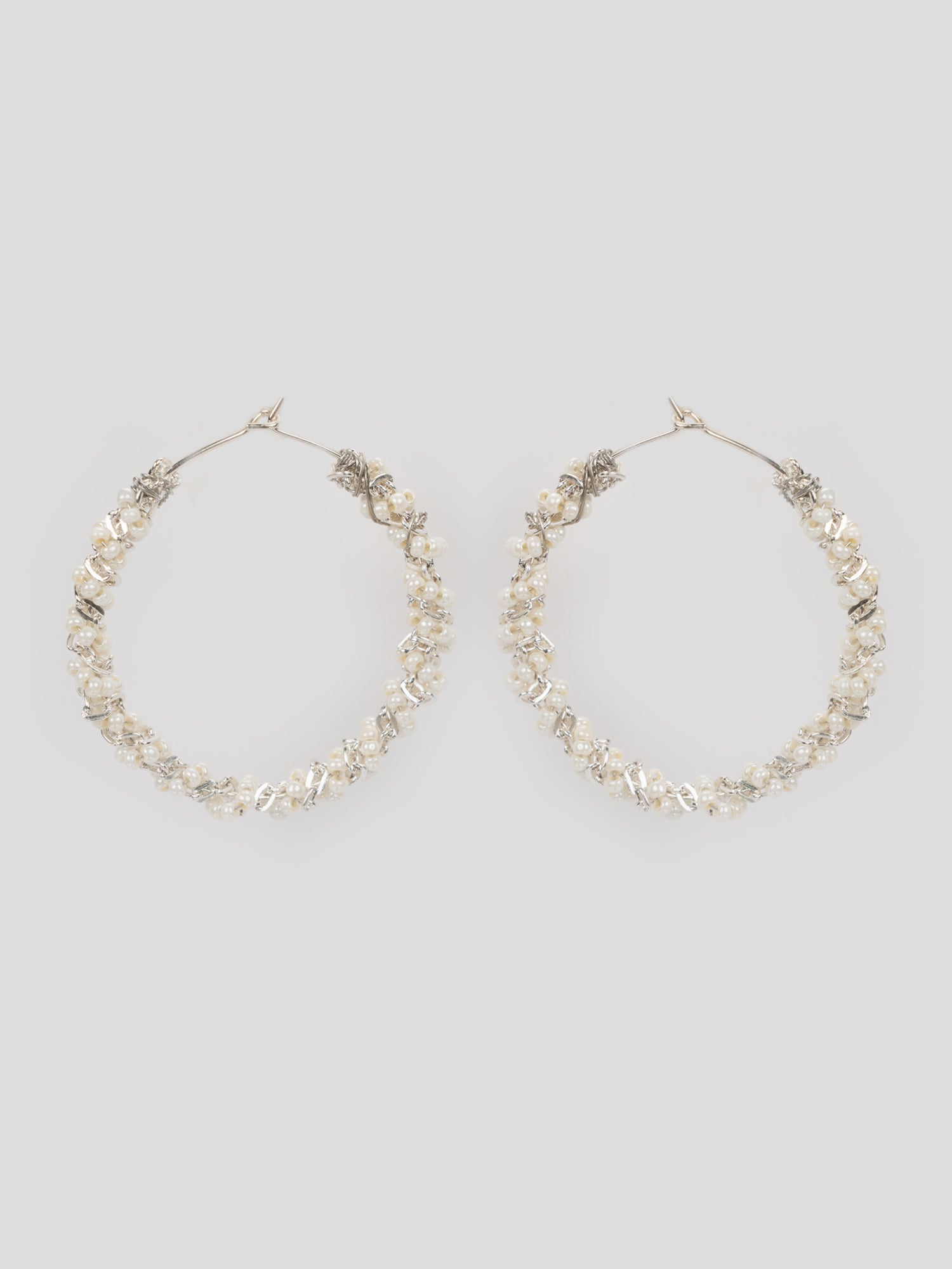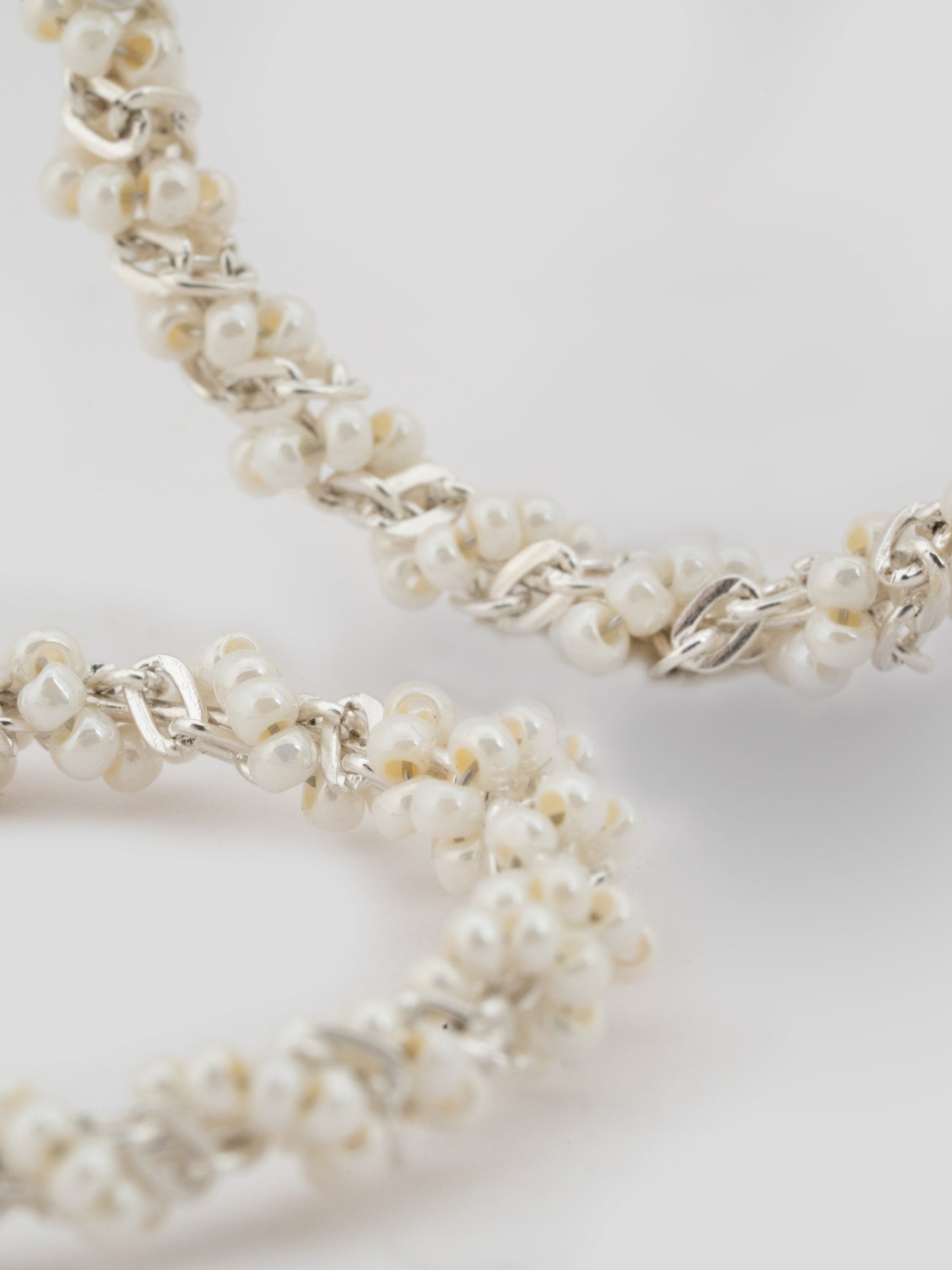 The Whimsical Swirl Hoop earring is a delightful creation crafted entirely from lustrous white beads, intricately wrapped around its hoop. Its design evokes a sense of enchanting movement and elegance, as the beads create a mesmerizing swirl pattern. These hoops are a versatile accessory that adds a touch of whimsy and sophistication to any outfit, perfect for those seeking a playful yet stylish look.